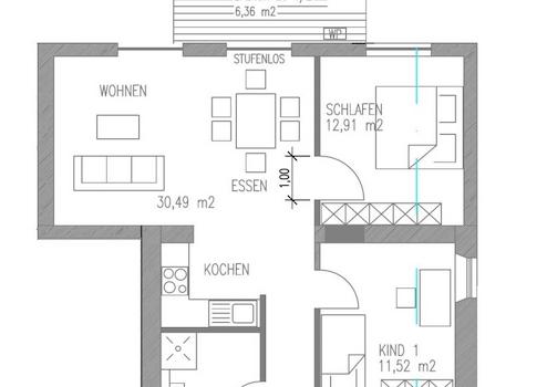 Das Angebot bezieht sich auf die Wohnung 6 im Obergeschoß des Hauses 20. Die Wohnung besteht aus dem attraktiven Bereich Wohnen/Essen/Kochen von ca. 35 m² mit Zugang zum großen Balkon von ca. 23 m². Von der zentralen Diele mit Garderobe erreichen Sie das schöne Kinderzimmer/ Büro von ca. 13 m² (ebenfalls mit Ausgang auf den großen Balkon),