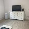 Wohn/Schlafbereich: Ein gemütliches Schlafsofa, große Kommode mit vielen Schubladen sowie ein großes Kleiderschrank.
