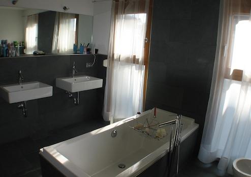 Bodenbeläge Hauptwohnung: hochwertiges Kirschbaumparkett u. echter Schiefer (Naturstein)