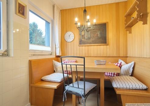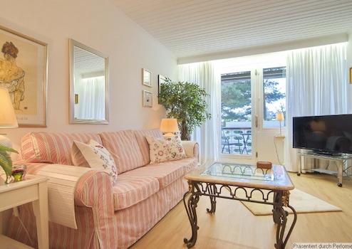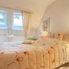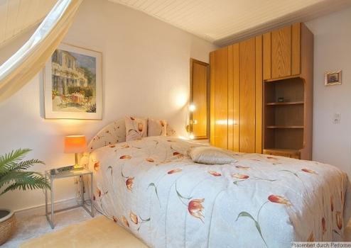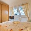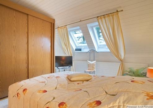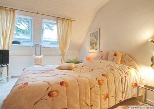 Möblierung und Inventar sind komplett vorhanden. Wohnzimmer mit Sofa, großem TV-Gerät (internetfähig), Sessel mit Hocker und Zugang zum Balkon mit Markise und Blick in den Garten, für den Balkon stehen Stühle mit Polstern bereit. Internetzugang ist über W-LAN vorhanden. Die Küche ist separat und mit einer Einbauküche ausgestattet, inklusive Kühl-Gefrier-Kombination, E-Herd, Microwelle, Kaffeemaschine, Toaster etc. sowie vollständigem Geschirr und Kochutensilien. Eine gemütliche Sitzecke und der schöne Blick aus den Fenstern laden für den Kaffee am Morgen und das Abendessen ein. Das Schlafzimmer ist mit einem 1,40 Meter breiten Bett und einem großen Kleiderschrank sowie einem Wäscheschrank möbliert, es gibt ein 2., internetfähiges TV und neue, 3fach-verglaste Dachflächenfenster mit Plissées. Das Badezimmer hat eine Dusche, Waschbecken mit beleuchtetem Spiegel, Toilette und ein Fenster, hier sind auch die Waschmaschine und der Wäschetrockner untergebracht. Außerdem gibt es einen Einbauschrank mit Duschtüchern, Handtüchern und sogar einem Fön.