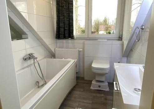 Obergeschoss: Hauptschlafzimmer, Badezimmer mit Badewanne, Kinderzimmer mit Dachschräge.(Hinweis: Aufgrund der baurechtlichen Vorgaben des Bauamts ist das Zimmer im Obergeschoss, das als Kinderzimmer vorgesehen ist, ein Raum mit schrägem Dach. Es handelt sich um eine dreieckige Dachform mit einer maximalen Höhe von ca. 2,05 m. Bitte beachten Sie die Bilder im Anhang.)