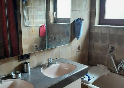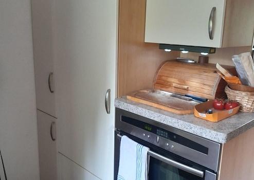 Das Haus hat eine neuwertige Einbauküche mit großem Gaskochfeld. Ein Gäste - WC und einen großen Garderobenbereich am Eingang. Einen wunderschönen Sandstein - Kaminofen im Wohnzimmer. Dunklen Fliesenboden und Fußbodenheizung im EG. Eine separat zu erreichende Einliegerwohnung mit kleiner Küche und Duschbad, die für Au Pair taugt oder vermietet werden kann.