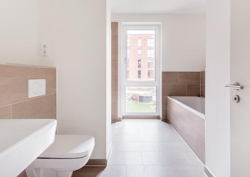Das Haupt-Badezimmer besitzt eine Badewanne, eine bodengleiche Dusche und ein Fenster, das für Tageslicht sorgt.