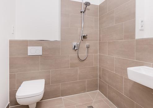Sandfarbene Wand- und Bodenfliesen prägen das Design der beiden Badezimmer.