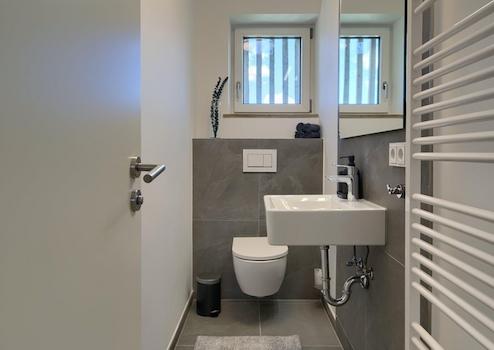 Komfort-Bad: Das moderne Badezimmer ist ein echtes Schmuckstück und verfügt über eine schicke Walk-In-Dusche. Zusätzlich gibt es eine separates WC.