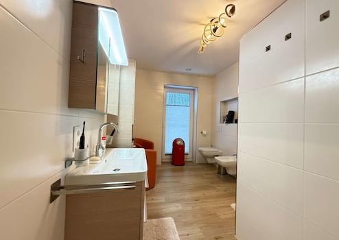 Das moderne Badezimmer ist hochwertig ausgestattet mit einer bodentiefen Dusche, eleganten Badmöbeln sowie einem Anschluss für eine Infrarotsauna – Wellnesskomfort in den eigenen vier Wänden. Ergänzt wird das Raumangebot durch ein separates, stilvolles Gäste-WC.