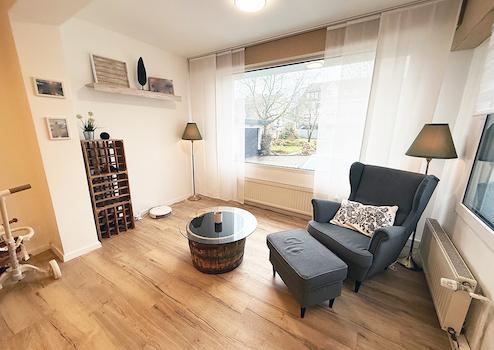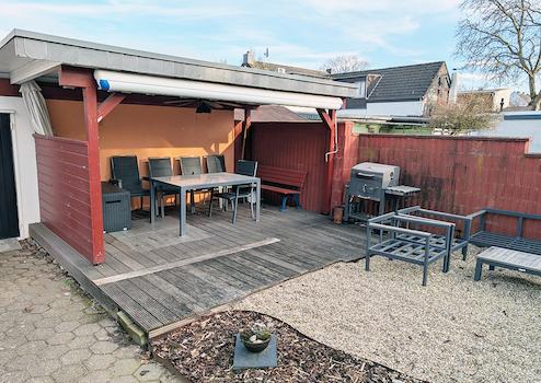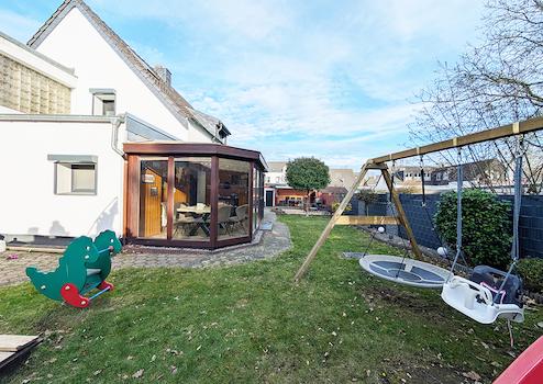Ergänzt wird das Erdgeschoss durch einen wintergartenähnlichen Anbau, der als schöner Rückzugsort genutzt werden kann. Der Blick fällt in den großzügigen Garten. Eine überdachte Terrasse mit Markise, eine Grillmöglichkeit und eine Feuerschale runden den Außenbereich perfekt ab.
