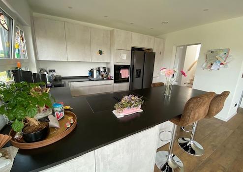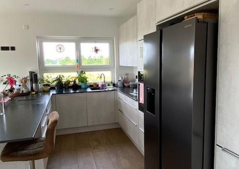 Die Designküche mit Granitarbeitsplatte, Side-by-Side-Kühlschrank und hochwertigen Geräten ist bereits inklusive – ideal für gemeinsame Kochabende. Ein Gästezimmer (oder Homeoffice) sowie ein modernes Dusch-WC komplettieren das Erdgeschoss.