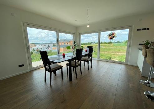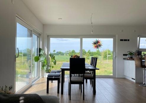 - Zwei große Panoramafenster (je 3,40 m) im Wohnbereich