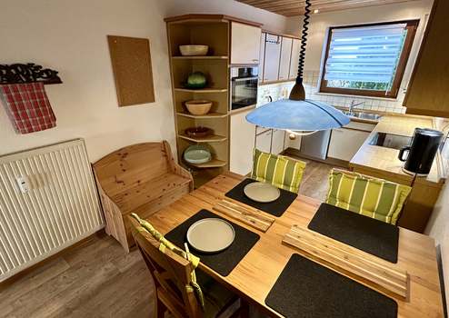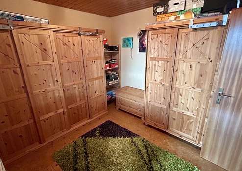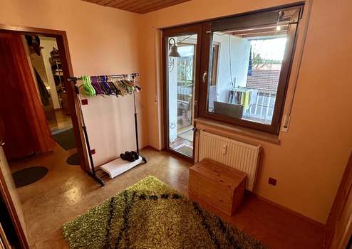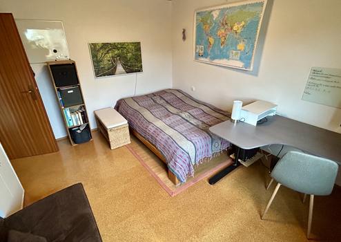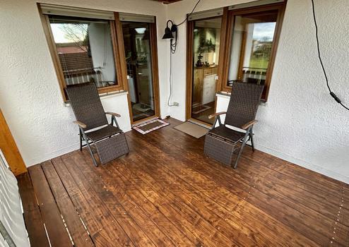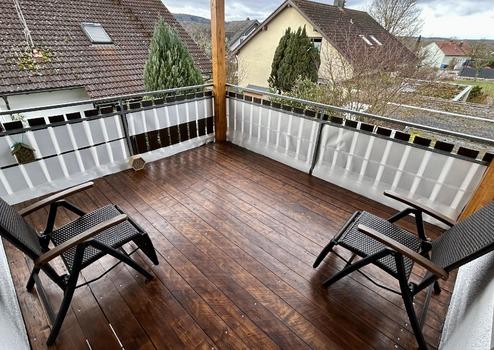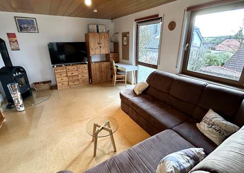 Der großzügige Wohnbereich bildet das Herzstück der Wohnung und überzeugt durch teilweise bodentiefe Fenster, die für ein besonders helles und freundliches Ambiente sorgen. Ein Kaminofen, der 2023 erneuert wurde, sorgt zusätzlich für gemütliche Stunden. Vom Wohnzimmer und einem der beiden Schlafzimmer gelangen Sie auf den überdachten Südbalkon, der zum Entspannen und Verweilen einlädt.