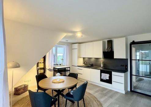 Jedes Apartment besticht durch eine stilvolle Einrichtung, hochwertige Materialien und eine durchdachte Raumgestaltung. Der offene Wohn- und Essbereich mit integrierter, voll ausgestatteter Küche schafft ein helles, einladendes Ambiente. Zwei komfortable Schlafzimmer, ein modernes Duschbad sowie ein sonniger Balkon mit Blick auf den Deich runden das Wohlfühlkonzept ab.