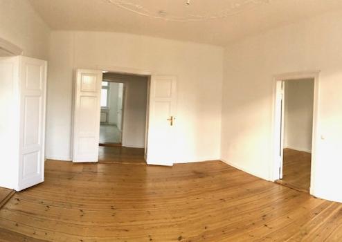 Der Umbau der Wohnung in eine 5- Zimmer Wohnung ist problemlos möglich. Dann würde es sich anbieten, einen Teil des großen Seitenflügel- Raumes (am Durchbruch zum großen Wohnraum), als Küche zu nutzen.