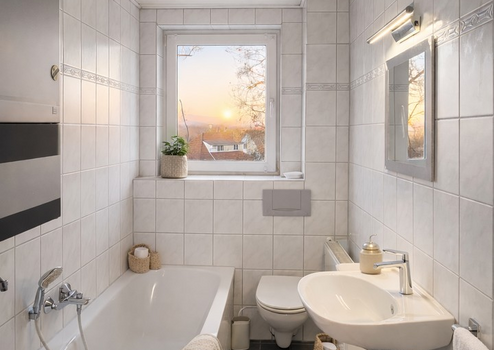 Die separate Küche ist funktional geschnitten und bietet ausreichend Platz für eine Einbauküche. Das Badezimmer ist hell gefliest und mit einer Badewanne ausgestattet.