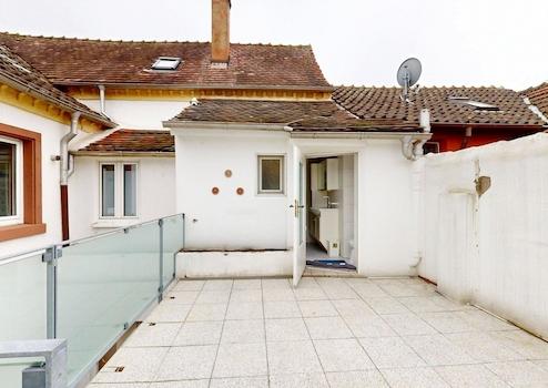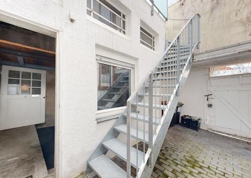 Das Obergeschoss ist über die zentrale Diele erschlossen und umfasst insgesamt vier Zimmer, von denen zwei als Durchgangszimmer gestaltet sind. Darüber hinaus befinden sich auf dieser Etage ein Duschbad mit WC sowie der Zugang zur großzügigen Terrasse. Von der Terrasse führt eine Stahltreppe direkt in den Innenhof, welches eine praktische Verbindung zwischen Wohn- und Außenbereich schafft.
