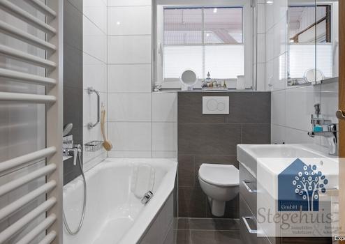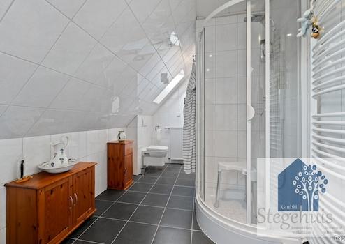 Hier befinden sich drei geräumige Schlafzimmer, die Ruhe und Rückzug bieten. Ein zweites, modernes Badezimmer sorgt dafür, dass auch am Morgen kein Engpass entsteht. Das Badezimmer ist wie folgt eingerichtet: Wanne, Dusche, Waschtisch und Toilette.