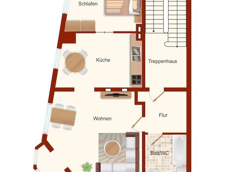 DG: 2 ZKB ca. 69m² Wohnfläche zzgl. ausgebautem Spitzboden (keine Unterlagen), Keller