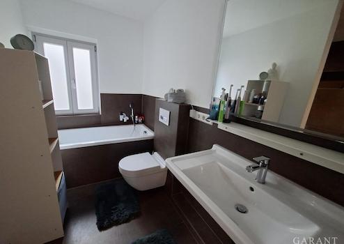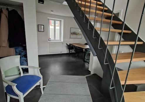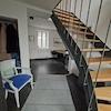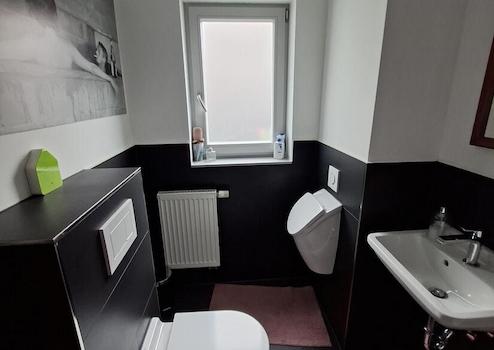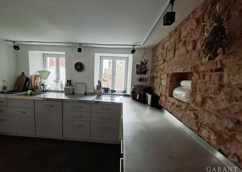 Im Erdgeschoss betreten Sie über die Diele den Wohn-/Essbereich mit offener moderner Küche. Im Wohnzimmer und der Küche wurden die Originalsandsteinwände in akribischer wochenlanger Arbeit wunderschön restauriert. Ein Kaminofen sorgt an kühlen Tagen für eine wohlige Wärme. Geschmackvolle neuwertige Vinylböden vermitteln ein tolles Wohnambiente. Ein großzügiges modernes Gäste-WC mit WC, Urinal und HWB hat zusätzlich Platz für Waschmaschine/Trockner.