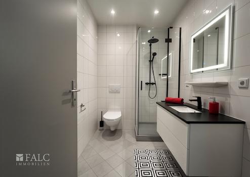 Das Badezimmer ist modern und gepflegt ausgestattet mit Dusche, Waschbecken und WC. Zusätzlich ist ein Waschmaschinenanschluss vorhanden, was für hohen Alltagskomfort sorgt.