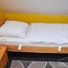 Wohn/Schlafzimmer mit Bett 90x200 cm, Kleiderschrank, Tisch, Fliesenboden, TV.