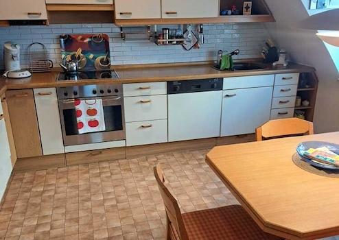 Zentraler Mittelpunkt der Wohnung ist die große Wohnküche, die vollständig ausgestattet ist und ausreichend Platz zum Kochen, Essen und Verweilen bietet. Badezimmer mit Badewanne