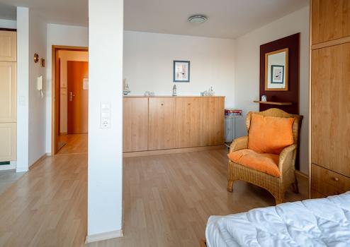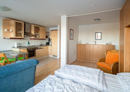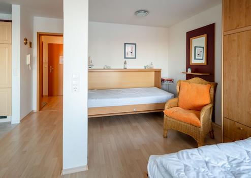 Das hier angebotene helle und freundliche 1-Zimmer Apartment liegt im 1. OG (ohne Fahrstuhl) eines Apartmenthauses (mit insgesamt 18 WE) , das im Jahr 2000 erbaut wurde. Die rund 37 m² Wohnfläche verteilen sich auf den Eingangsbereich mit separatem Abstellraum, das Bad mit Dusche und WC sowie den hellen Wohn-Schlafraum (ausklappbares Doppelbett plus Schrankbett) mit integrierter Einbauküche (inkl. Kühl- und Gefrierschrank). Ein Waschmaschinenanschluss ist außerdem vorhanden. Die Aussicht auf den Nordsee-Deich sowie den direkt angrenzenden Forellensee ist herrlich und entspannend. Wärme und Warmwasser kommen über eine Öl-Zentralheizung (Bj. 2000). Zur Wohnung gehört ebenfalls ein ca. 4 m² großer Kellerraum. Direkt vor dem Haus befindet sich der zugehörige Stellplatz. Zur Wohnung gehört auch ein gemeinsamer Abstellraum für Fahrräder. Ein Glasfaseranschluss ist vorbereitet. Das Hausgeld beträgt ca. 131 Euro/Monat (davon 31,74 Euro Instandhaltungsrücklage).