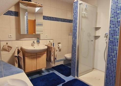 Im Obergeschoss befinden sich 2 Kinderzimmer, sowie ein Schlafzimmer und ein modernes Badezimmer mit Badewanne und Dusche.