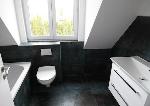 + Vollbad komplett saniert mit neuen Fliesen, Badewanne, Waschbecken mit Unterschrank, Badspiegel, Handtuchheizkörper usw.