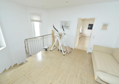 Das Obergeschoss beherbergt neben den Schlafzimmern und Bädern auch einen weiteren großzügigen Wohnbereich, der sich ideal als Bibliothek oder Arbeitszimmer eignet. Die Verwendung von Marmor setzt sich auch hier fort und verleiht den Räumen eine exklusive Note.