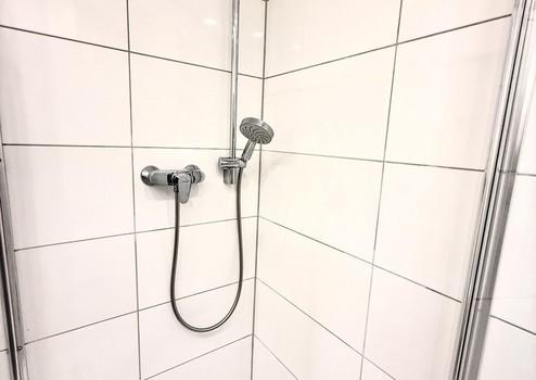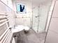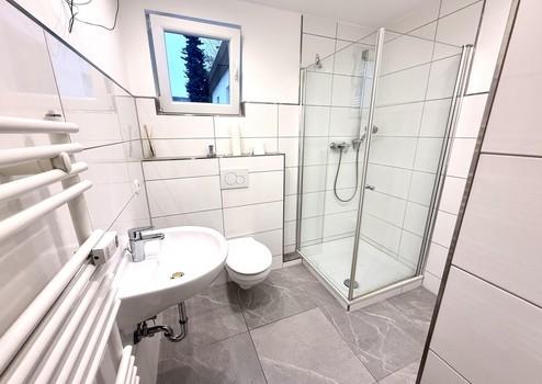 Das Badezimmer wurde vollständig erneuert und verfügt über eine Dusche mit Glasabtrennung, ein Hänge-WC sowie ein Fenster.