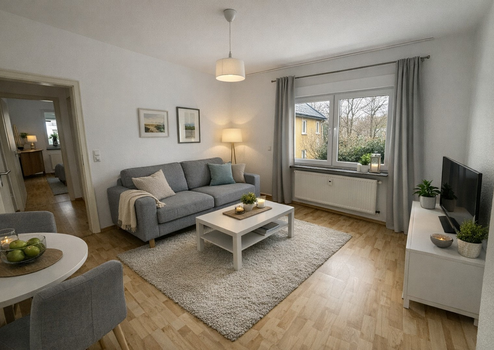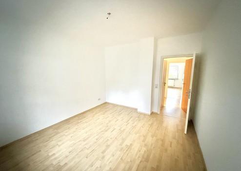 Die Wohnräume sind mit hellem Laminatboden ausgestattet, die Wände sind weiß gestrichen.