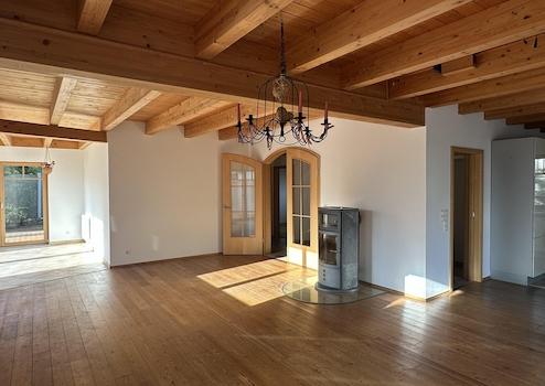 Im Erdgeschoss bietet ein Gäste-Bad und ein weitläufiger offener Wohn-/Essbereich mit Wintergarten, zentralem Specksteinofen hohen Wohnkomfort. Die offene Küche hat eine ansprechende Ausstattung mit großen Fenstern und Rundumblick.