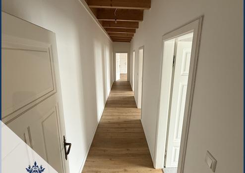 Die Wohnung verfügt über drei großzügige Zimmer, darunter ein weitläufiges Wohnzimmer, das durch seine offene Gestaltung und die großen Fensterfronten besonders hell und einladend wirkt. Die lichtdurchfluteten Räume sorgen für ein angenehmes Wohngefühl und unterstreichen den durchdachten Schnitt der Wohnung. Dank der charmanten Holzdecken entsteht eine warme, wohnliche Atmosphäre, die den Charakter der Wohnung zusätzlich unterstreicht.