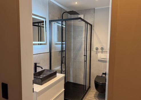 - Badezimmer mit hochwertiger Ausstattung (Dusche, Waschtisch mit Aufsatzwaschtisch und Unterschrank, WC und Badheizkörper)
