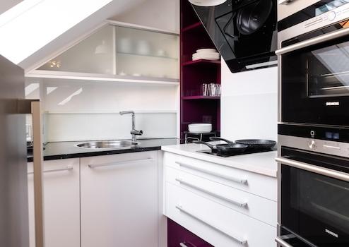 Die Küche ist neu und hochwertig ausgestattet mit Markengeräten von Siemens, inklusive Backofen, Spülmaschine sowie vollständigem Kücheninventar.