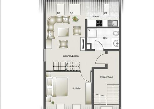 Der offene Wohn- und Küchenbereich schafft eine angenehme Wohnatmosphäre und eignet sich ideal sowohl für kleine Familien als auch für eine Studenten-WG.