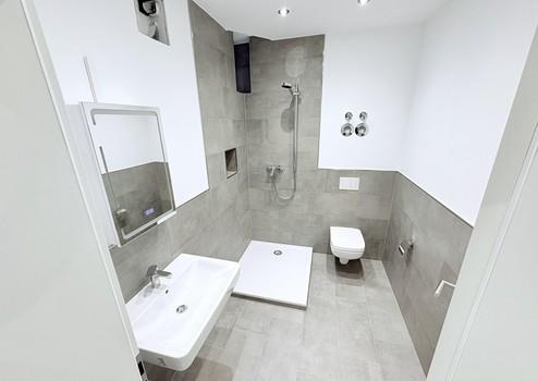 - Modernes, gefliestes Bad mit Fenster nach Osten