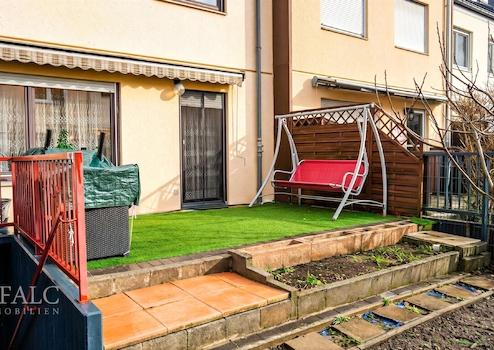Der Wohn- und Essbereich öffnet sich zur Terrasse mit angrenzendem, liebevoll angelegtem kleinen Garten, der als geschützter Rückzugsort im Freien dient und den Wohnraum ideal erweitert. Ob gemeinsame Mahlzeiten im Sommer, entspannte Stunden nach Feierabend oder Spielfläche für Kinder – dieser Außenbereich bietet vielfältige Nutzungsmöglichkeiten.