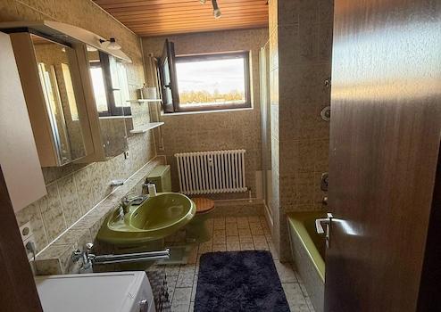 Die Küche ist separat angeordnet und bietet genügend Raum für eine individuelle Planung. Das Badezimmer ist mit einer Badewanne ausgestattet, zusätzlich steht ein separates WC zur Verfügung. Die Ausstattung entspricht überwiegend dem Baujahr, befindet sich jedoch in einem gepflegten Zustand. Modernisierungen bieten die Möglichkeit, die Wohnung zeitgemäß zu gestalten und den Wohnwert weiter zu steigern.