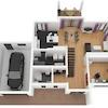 Das Fertighaus Köln bietet durch die offene Gestaltung mit einer Galerie, ein exklusives Wohnraumgefühl mit viel Platz für die ganze Familie. Im Erdgeschoss des Energiesparhauses befindet sich der offen gestaltete Wohn-/Essbereich mit Küche, ein Arbeitszimmer, ein Duschbad und ein Hauswirtschafts-/und Technikraum. Der Haustechnikraum ist direkt neben der Garage angesiedelt und kann auch durch die Garage betreten werden. Das bietet im täglichen Ablauf viele Vorteile, denn die Einkäufe oder z. B. schmutzige Sportbekleidung können gleich im Hauswirtschafts- und Technikraum verbleiben. Beim Hauseingang ist ein separater Bereich für die Garderobe vorgesehen. Sechs große Terrassentüren öffnen den Wohnbereich zur überdachten Terrasse und zum Garten hin.