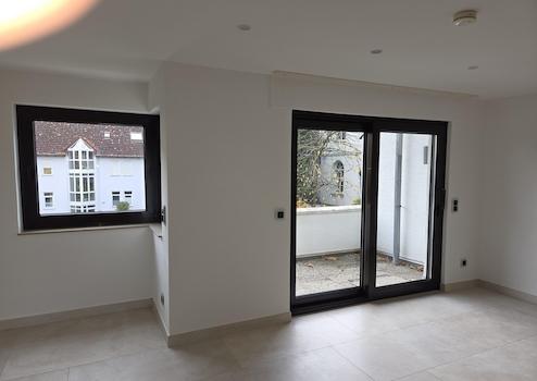 Der Wohnbereich gestaltet sich hell und luftig mit teilweise bodentiefen Fenstern, großformatigen Fliesen und Zugang über eine breite Schiebetür zum Balkon.