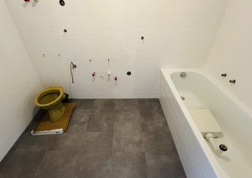 Badezimmer und Küche sind Hell gefliest, und mit einem Vinyl Boden ausgestattet.