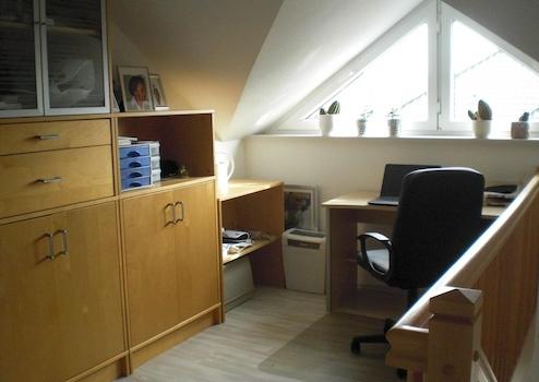Über die Echtholzbuchentreppe geht es hinauf in das Dachgeschoss, das komplett ausgebaut ist und teilt sich wie folgt auf:
