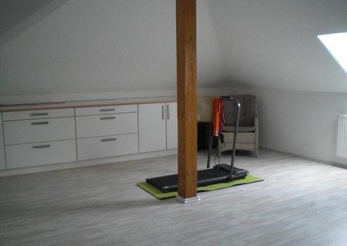 Das komplette Erdgeschoß ist mit Fliesen ausgestattet . Nur im Bad , Diele , Schlafzimmer und Ankleidezimmer /Büro ist ein Klickvinyl schwimmend verlegt worden (d.h. dieses kann ohne grossen Aufwand entfernt werden ).