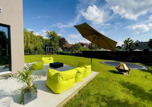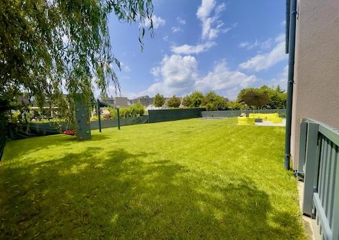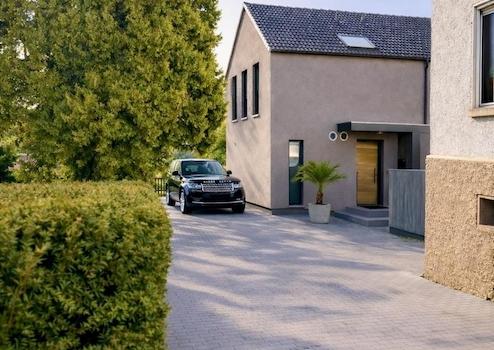 Der Garten bietet eine großzügige Grünfläche mit vielfältigen Gestaltungsmöglichkeiten. Terrasse, Gartenhaus mit Werkstatt sowie eine Regenwasserzisterne runden das Angebot ab. Der vorbereitete Garagen Stellplatz für zwei Fahrzeuge ermöglicht auch die spätere Installation einer E-Ladestation.