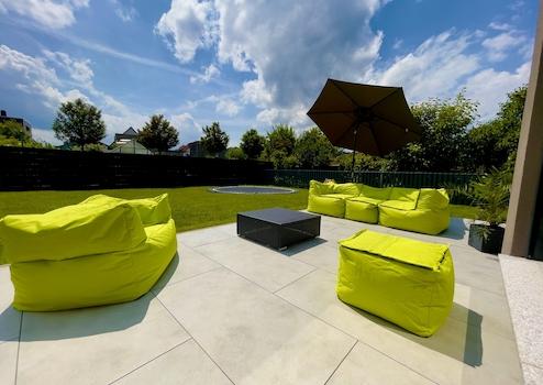 Die Südterrasse, direkt vom Wohnbereich aus erreichbar, bietet ideale Voraussetzungen, um die Sonne vom Frühjahr bis in die Abendstunden zu genießen. Im Sommer wird sie zum erweiterten Wohnraum – perfekt für entspannte Stunden, Familienzeit oder gesellige Abende im Freien.