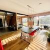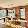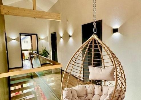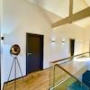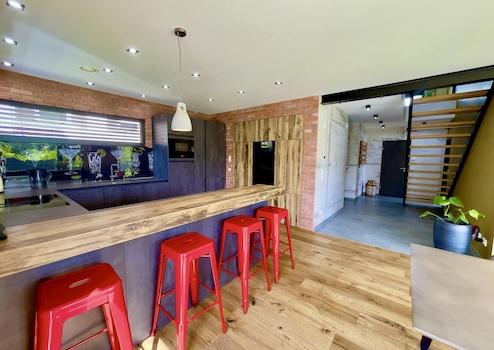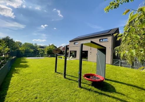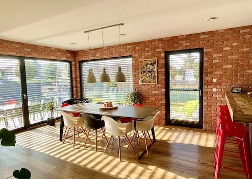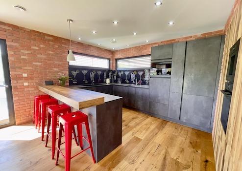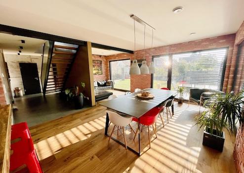 Das markante Satteldach mit erhöhten Deckenhöhen verleiht dem Haus Großzügigkeit und eine besondere räumliche Wirkung. Im Inneren trifft eine moderne, leicht industrielle Gestaltung auf warme Materialien: sichtbare schwarz lackierte Stahlelemente, ausgewählte Wandflächen in Ziegel und Betonoptik sowie ein hochwertiges, naturgeöltes Eichenparkett schaffen ein harmonisches und zugleich individuelles Wohnambiente.