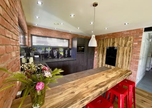 Die hochwertige Einbauküche der Marke BALLERINA in moderner Betonoptik ist ein weiteres Highlight. Sie ist mit energieeffizienten BOSCH-Geräten ausgestattet und bietet viel Arbeitsfläche, Stauraum sowie eine integrierte Vorratskammer – ideal für Familien und Kochliebhaber.