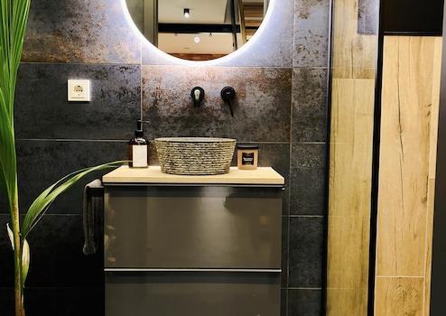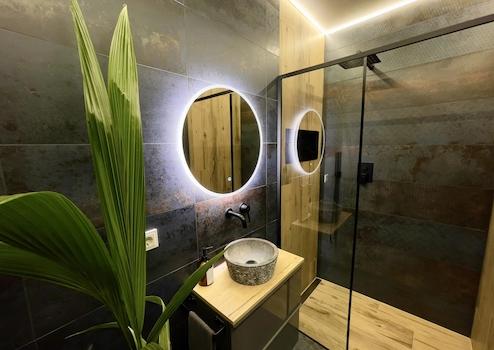 Die Badezimmer wurden mit viel Liebe zum Detail gestaltet. Im Erdgeschoss befindet sich ein Gäste-WC mit Dusche, ausgestattet mit Designfliesen in Metall-Rostoptik und warmen Holzdetails. Das Hauptbad im Obergeschoss überzeugt mit großem Dachfenster, hochwertigen Oberflächen in Feinputz und Schalbetonoptik, moderner Sanitärausstattung sowie einer großzügigen Dusche und freistehenden Badewanne.