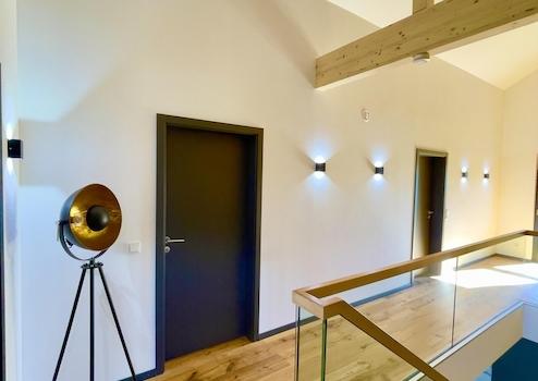 Die Raumhöhen liegen deutlich über dem Standard: 2,52 m im Erdgeschoss sowie ein lichter Kniestock von 1,80 m im Obergeschoss. Im Galeriebereich entstehen Höhen von über 4 m, die ein beeindruckendes Raumgefühl erzeugen. Die massive Eichentreppe mit Glasgeländer fügt sich als architektonisches Highlight nahtlos in das Gesamtkonzept ein.