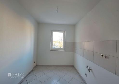 Rechts vom Eingang befindet sich die Küche. Der Raum ist hell, mit Fenster und pflegeleichtem Fliesenboden. Die Anschlüsse sind entlang der Wand vorbereitet, sodass sich eine Küchenzeile gut planen lässt. Ein kleiner Essplatz passt ebenfalls, ideal für das Frühstück oder Hausaufgaben.